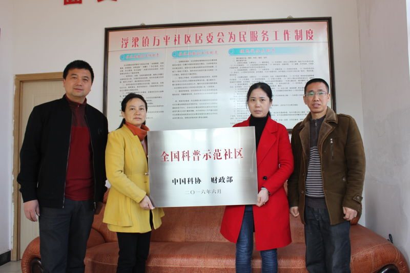 3月14日上午,浮梁县科学技术协会负责人来到浮梁镇万平社区,将一块由中国科协、财政部颁发的“全国科普示范社区”牌匾授予万平社区负责人。